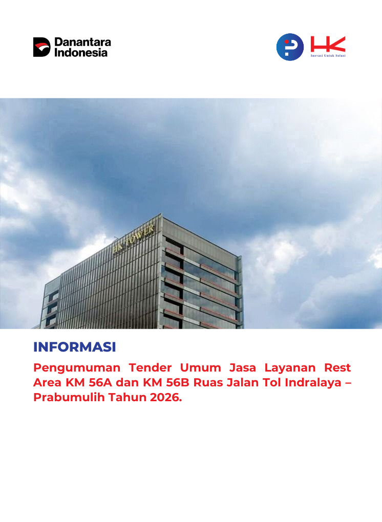 Jan 12, 2026 Pengumuman Tender Umum Jasa Layanan Rest Area KM 56A dan KM 56B Ruas Jalan Tol Indralaya – Prabumulih Tahun 2026